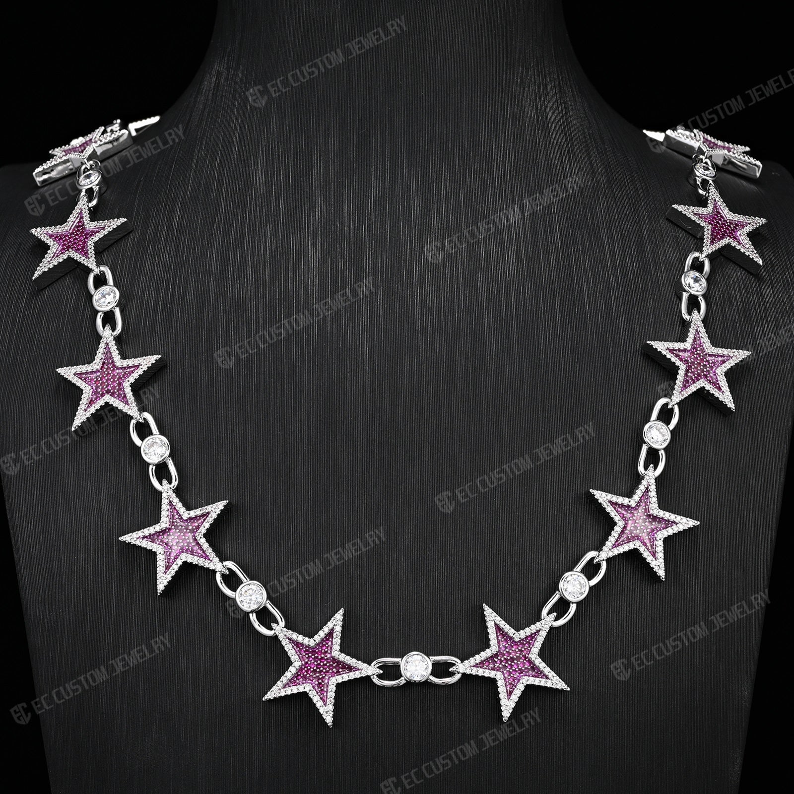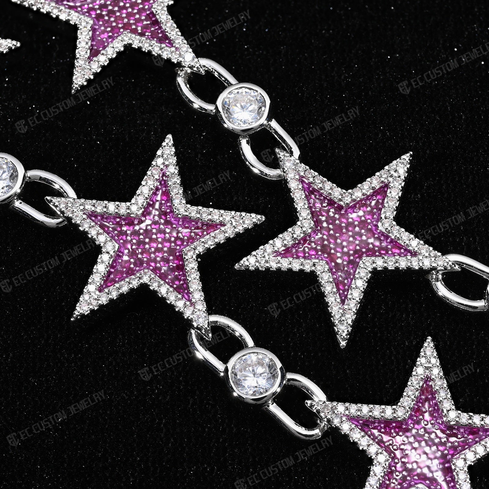 The Starlink Necklace breaks away from traditional Cuban and Tennis chains. It’s a specialized piece of rapper jewelry that stands out during performances, club nights, or high-profile events. The contrast between the icy white border and the deep purple/pink star centers creates a visual "pop" that looks incredible under stage lights or camera flashes.